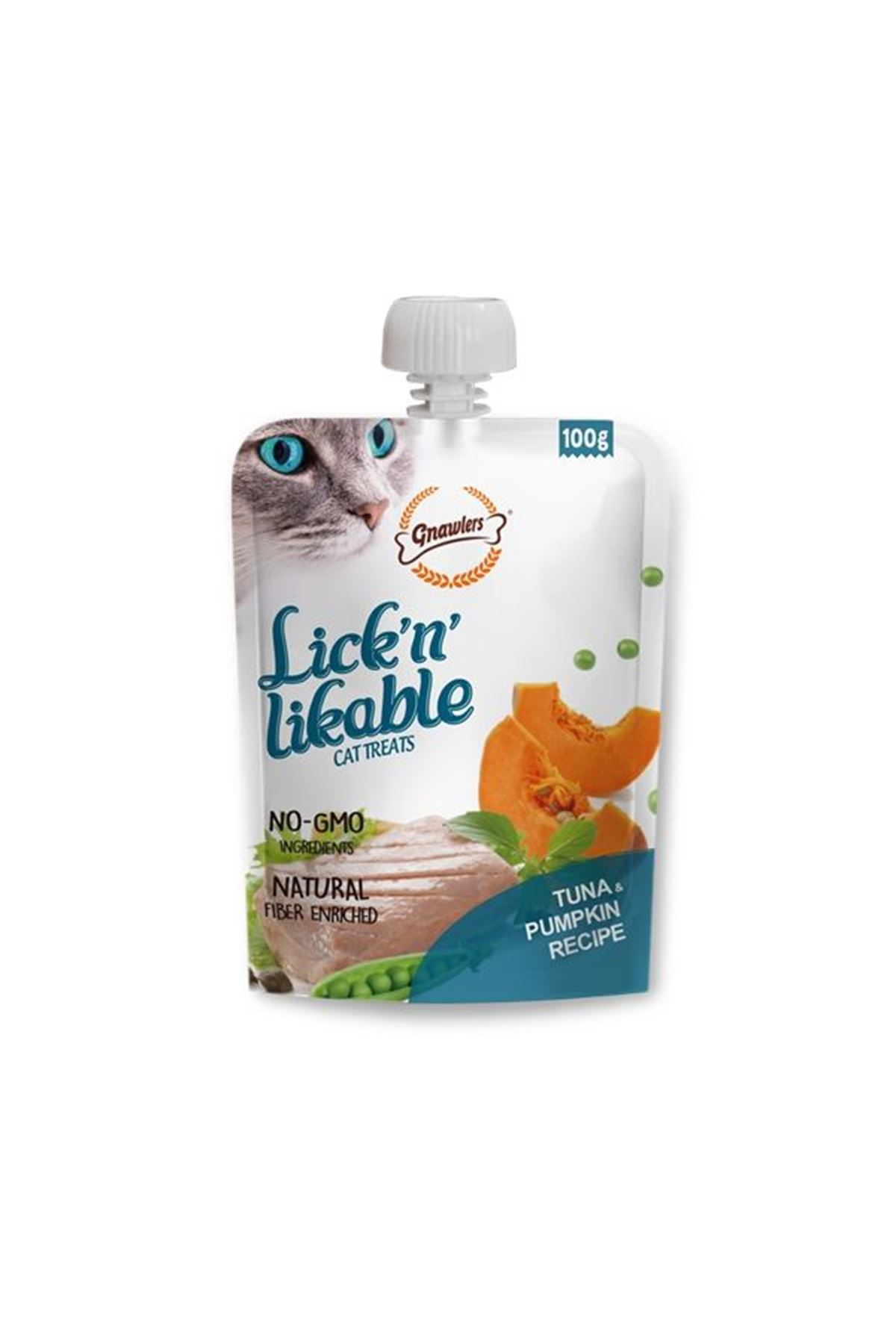 GNAWLERS Lick'n' Likable Ton Balığı & Bal Kabağı Kedi Ödülleri, kedinizin sevdiği gerçek, Ton Balığı ve Bal Kabağılerle hazırlanmış, GMO içermeyen bir tarif sunar.