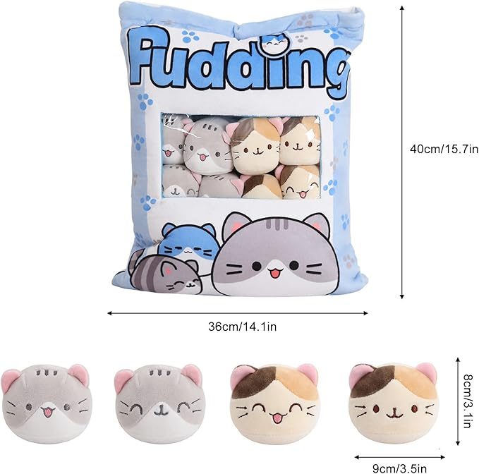 - Eğlenceli ve sevimli atıştırmalık yastık oyuncağı: Bu oyuncak, içinde 8 sevimli kedi peluş bulunan bir kırlent çantasıdır. Bu nedenle yumuşak ve sevimli kedilerle oynamaktan keyif alan çocuklar için eğlenceli ve sevimli bir oyuncaktır. Ayrıca yastık kılıfını ve kedileri kanepenizde, yatağınızda veya başka herhangi bir yerde gösterebileceğiniz için ev dekorasyonu için güzel bir oyuncak.