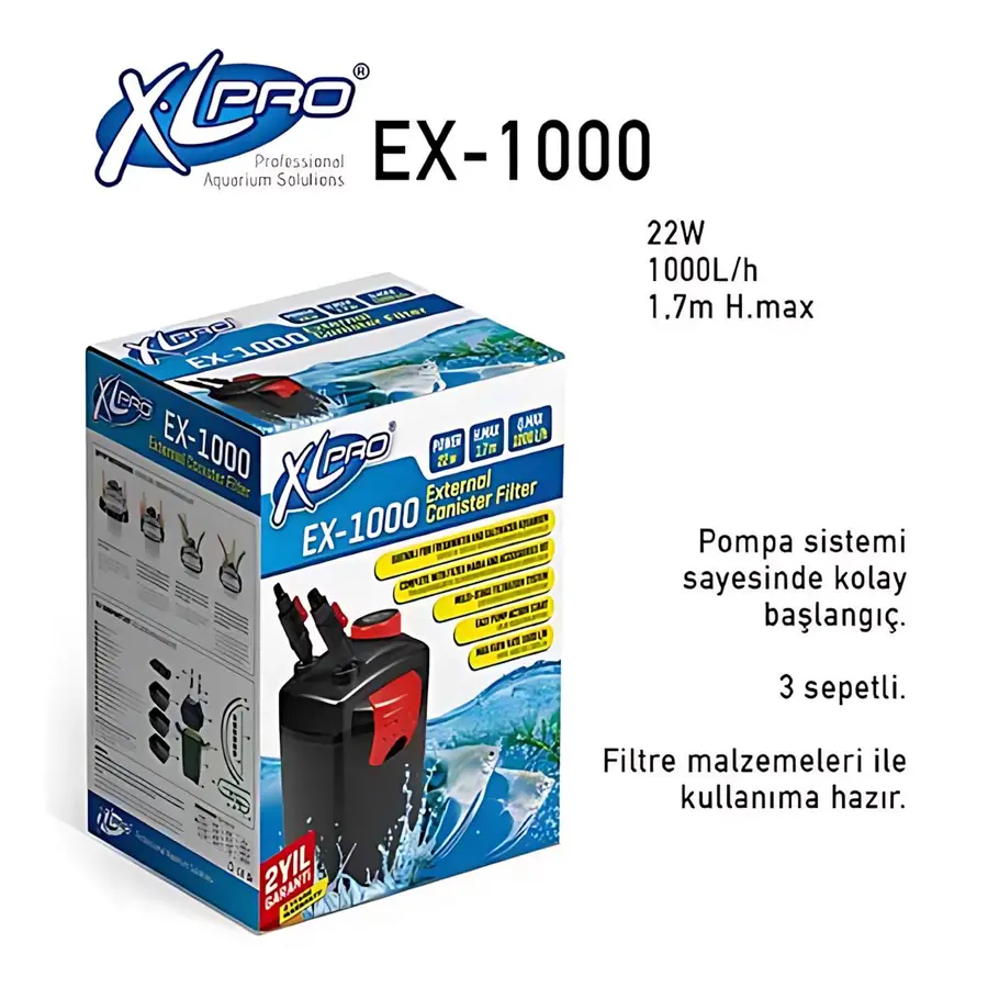 XLPRO EX-1000 Dış Filtre, 200 litreye kadar olan akvaryumlar için tasarlanmış, 1000 L/H debiye sahip yüksek performanslı bir dış filtredir. Gelişmiş filtreleme sistemi ile mekanik, biyolojik ve kimyasal filtrasyonu etkili bir şekilde sağlar. Dolu versiyonu ile kullanıma hazır halde gelir ve kurulum kolaylığı sunar. Enerji tasarruflu motoru ile sessiz ve verimli çalışır.