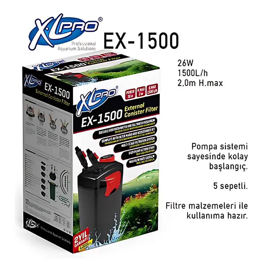 XLPRO EX-1500 Dış Filtre, 300 litreye kadar olan akvaryumlar için tasarlanmış, 1500 L/H debiye sahip yüksek performanslı bir dış filtredir. Gelişmiş filtreleme sistemi ile mekanik, biyolojik ve kimyasal filtrasyonu etkili bir şekilde sağlar. Dolu (içi hazır medya dolu) versiyonu ile kullanıma hazır halde gelir ve kurulum kolaylığı sunar. Enerji tasarruflu motoru ile sessiz ve verimli çalışır.